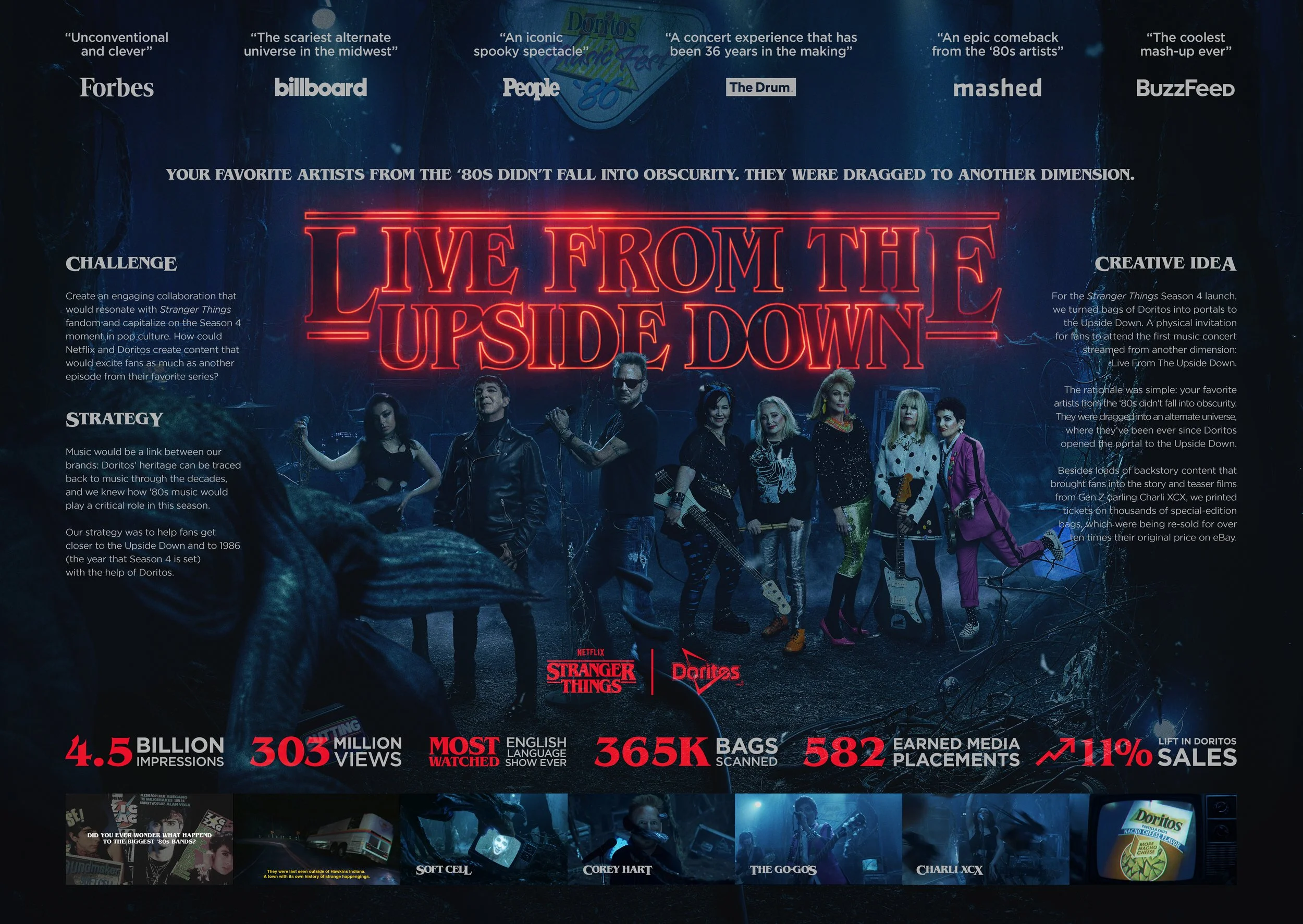 Doritos partnered with Netflix's Stranger Things to put on the greatest concert that never happened: "Live From The Upside Down." By turning a Doritos bag into the ticket for a 1986 music festival in the Upside Down, Doritos drove sales, increased market share, and contributed to the most significant Stranger Things season ever.