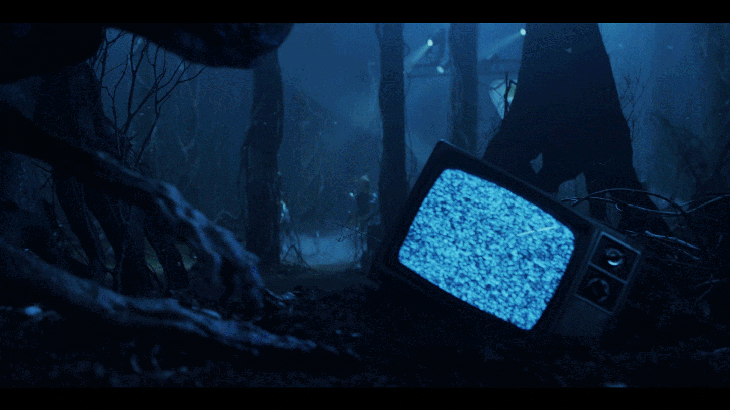 As a first-of-its-kind virtual concert, the production played a vital role. It's ominous, moody, and covered in vines and spores. There are easter eggs from the show all over the set: BMX Bikes lying in the mud, a broken chain-link fence with a "Hawkins National Laboratory" sign, a phone booth, a "Dig Dug" arcade cabinet, half-buried TVs, Walkie-Talkies, and more. The TVs play a loop of VHS static where we sporadically catch clips and moments from Stranger Things Season 4 and authentic Doritos ads from the '80s.